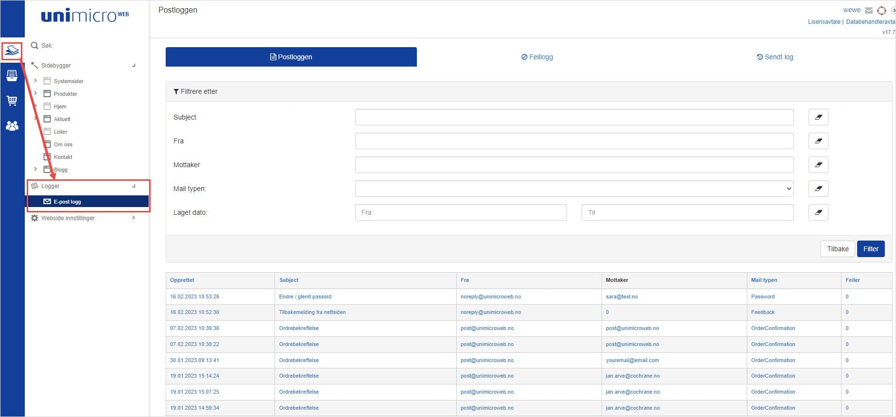- Mottaker: Du kan også sortere ut e-post på mottakeradresse. Eksempelvis om en kunde ikke har mottatt ordrebekreftelse kan du søke etter mottakeren direkte på e-postadresse og se om e-post er sendt eller om den har feilet.