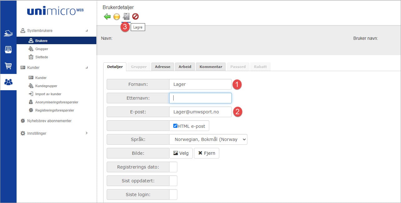 1 og 2. En systembruker må minimum ha fornavn og e-post adresse (e-post adressen er brukernavn ved innlogging)