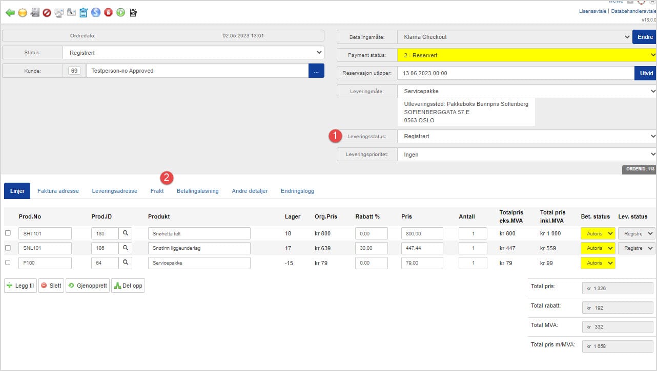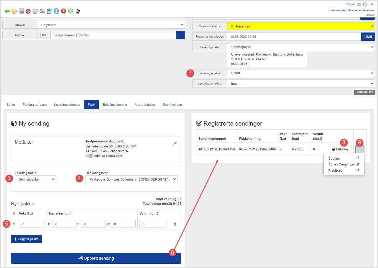 1. Før man har opprette en sending vil leveringsstatus være "Registrert" på webordren