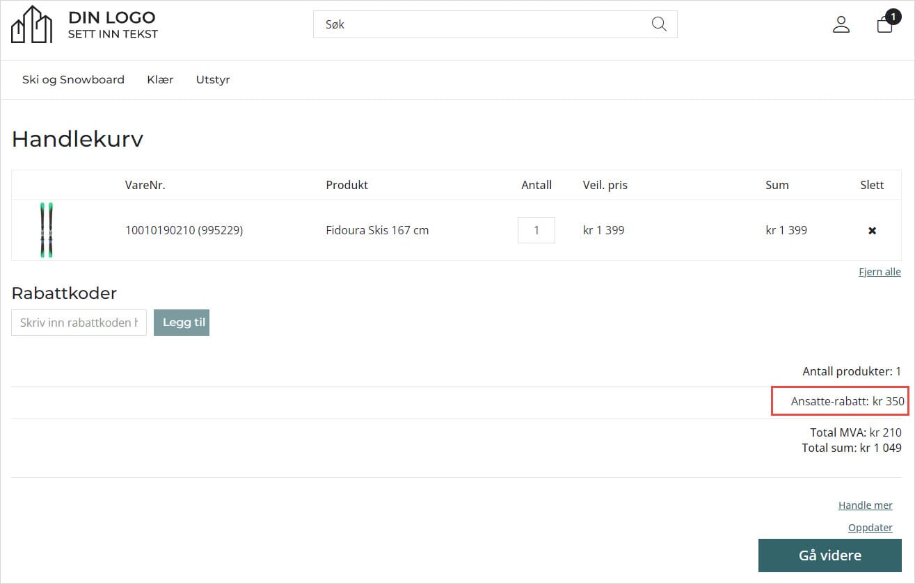 Slik ser det ut for en kunde i gruppen Ansatte som legger inn en ordre på over 1000,-