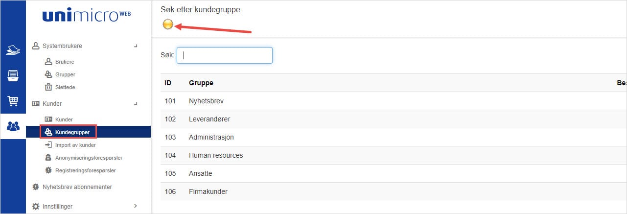 Fra kundegrupper kan du enkelt lage en ny kundegruppe ved å trykke på ikonet (solen), men i eksempelet benyttes en allerede eksisterende kundegruppe "101 Nyhetsbrev".