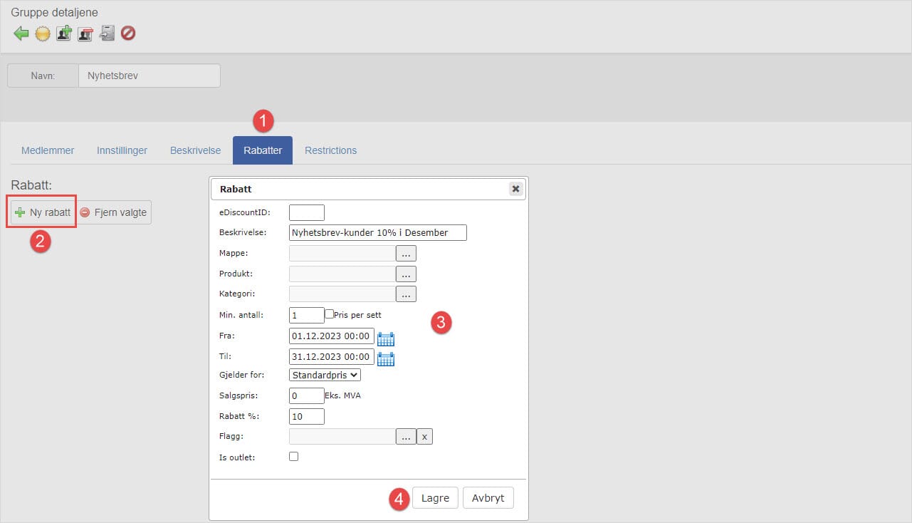 Vi anbefaler bruk av beskrivelser når det lages rabatter, dette for å ha best mulig oversikt i rabattoversikten etter hvert som antallet rabatter i systemet vokser.