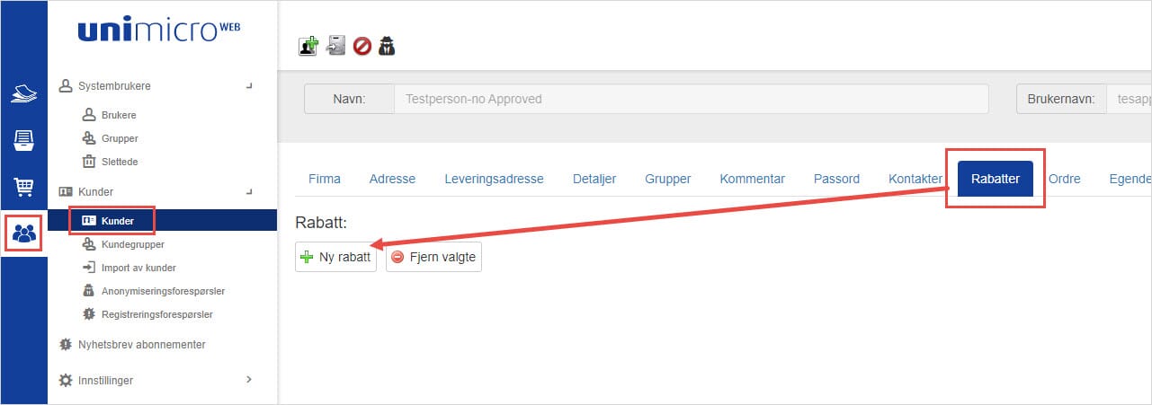 Søk opp kunden og lag rabatten under fanen Rabatter