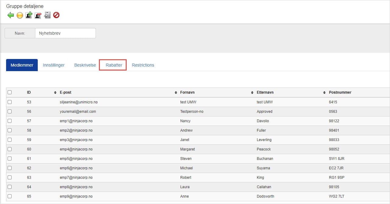 I dette tilfellet kan du legge en test-kunde inn i den aktuelle kundegruppen og logge inn for å se om du får ønsket rabatt i nettbutikken.